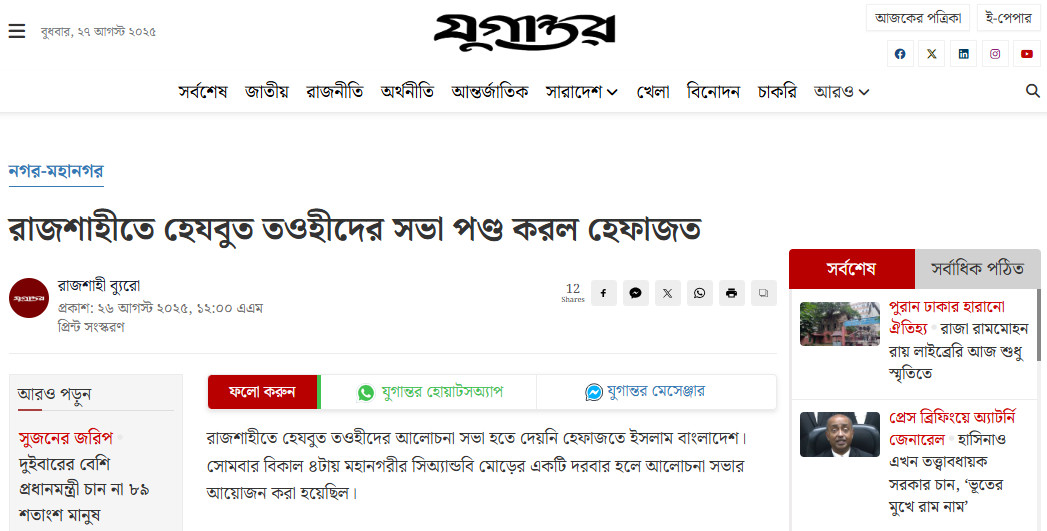 In Rajshahi, mob violence by Hefazat-e-Islam occurred on August 25, 2025. Hezbut Tawheed organized a forum on “Proposals for State System Reform,” inviting intellectuals, teachers, journalists, and writers. Extremists arrived early and violently protested, demanding a ban on all Hezbut Tawheed meetings and activities, and restricting access to religious institutions. Hezbut Tawheed leaders held a press conference at the divisional office to highlight the violation of their right to peaceful assembly, which was reported by national media outlets.